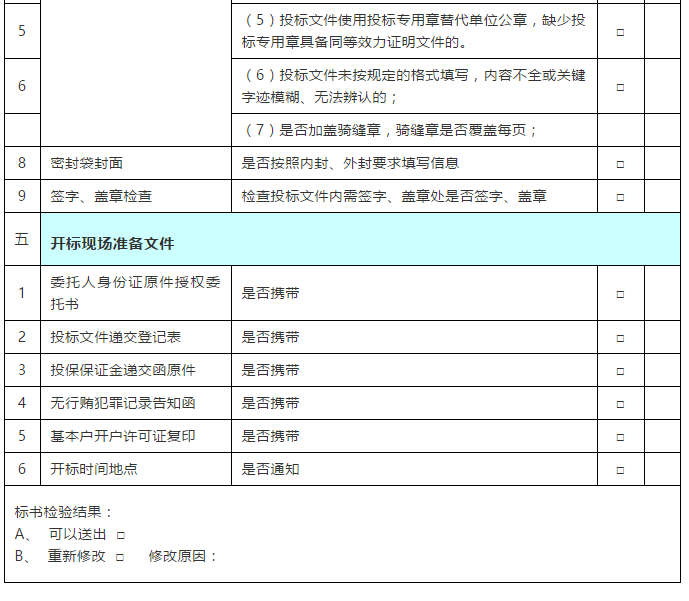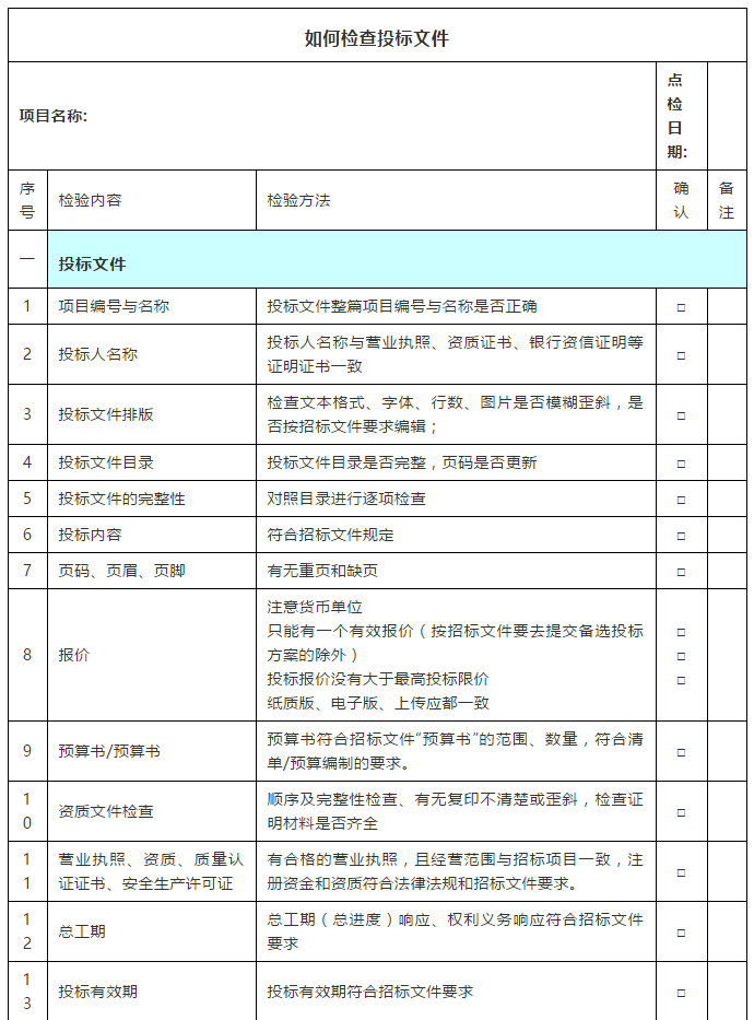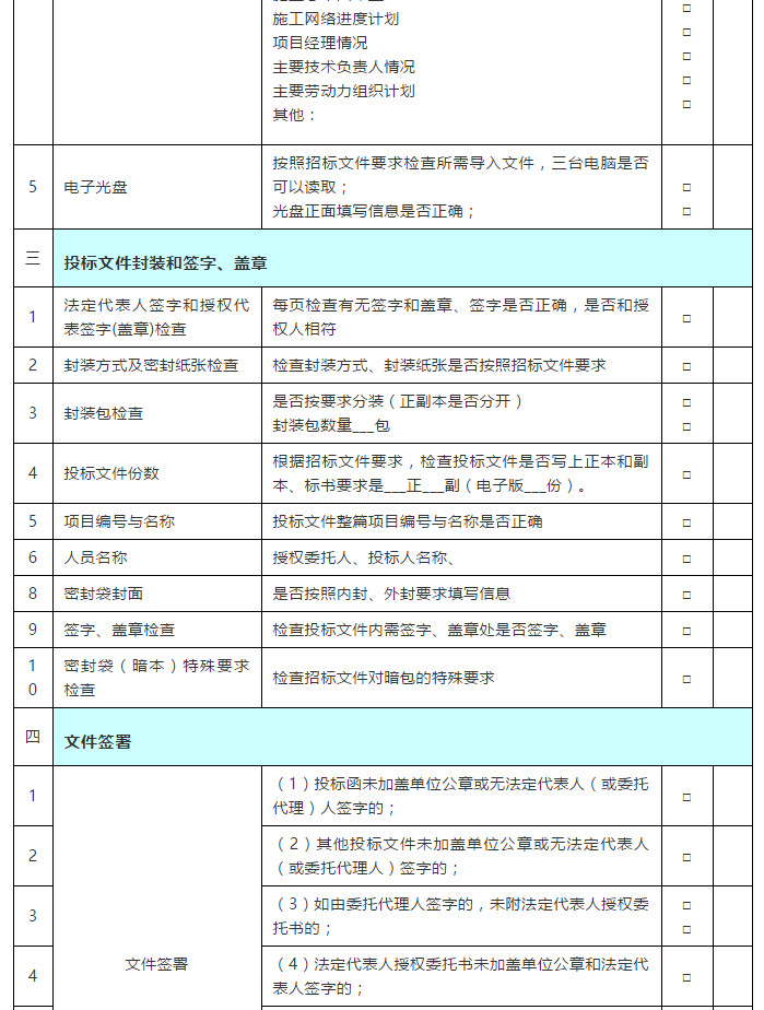 根據(jù)招標文件,好不容易辛苦制作的標書,卻在開標時因為一些細節(jié)未注意而遭遇廢標。按照下面這個表來檢查,5分鐘妥妥搞定!