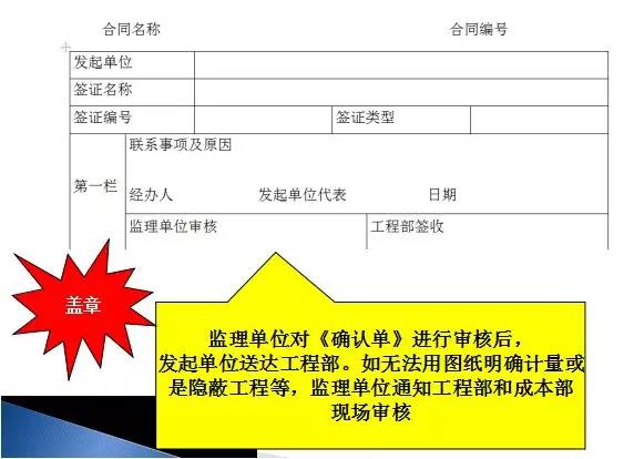 2、監(jiān)理單位對(duì)《確認(rèn)單》進(jìn)行審核后,發(fā)起單位送達(dá)項(xiàng)目公司工程部。如無(wú)法用圖紙明確計(jì)量或是隱蔽工程等,監(jiān)理單位通知工程部和成本部現(xiàn)場(chǎng)審核。