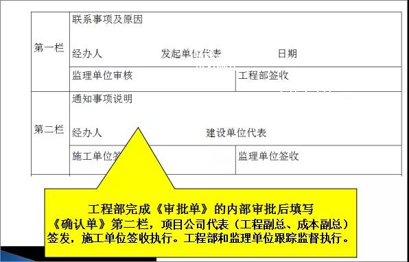 3、工程部對(duì)簽證原因、簽證內(nèi)容和現(xiàn)場(chǎng)情況進(jìn)行審核確認(rèn)后,填寫《確認(rèn)單》第二欄,項(xiàng)目公司代表(工程副總、成本副總)簽發(fā),施工單位簽收?qǐng)?zhí)行。工程部和監(jiān)理單位跟蹤監(jiān)督執(zhí)行。