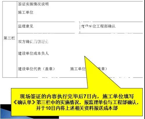 4.現(xiàn)場(chǎng)簽證的內(nèi)容執(zhí)行完畢后7日內(nèi),施工單位填寫《確認(rèn)單》第三欄中的實(shí)施情況,報(bào)監(jiān)理單位與工程部確認(rèn),并于10日內(nèi)將上述相關(guān)資料報(bào)送至項(xiàng)目公司成本控制部。